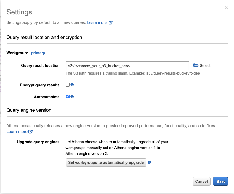 10. Setup an Amazon Athena output S3 bucket by clicking on the “settings” navigation at top right corner, and selecting the second S3 bucket previously created.