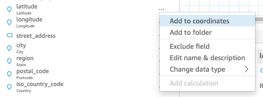 22. Click and drag the following fields to the “field wells” > latitude/longitude to “geospatial”, location_name to “size”, and top_category to “color."