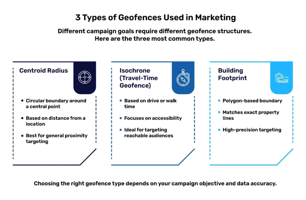 - Different geofence types include radius-based, travel-time, and building footprint methods.