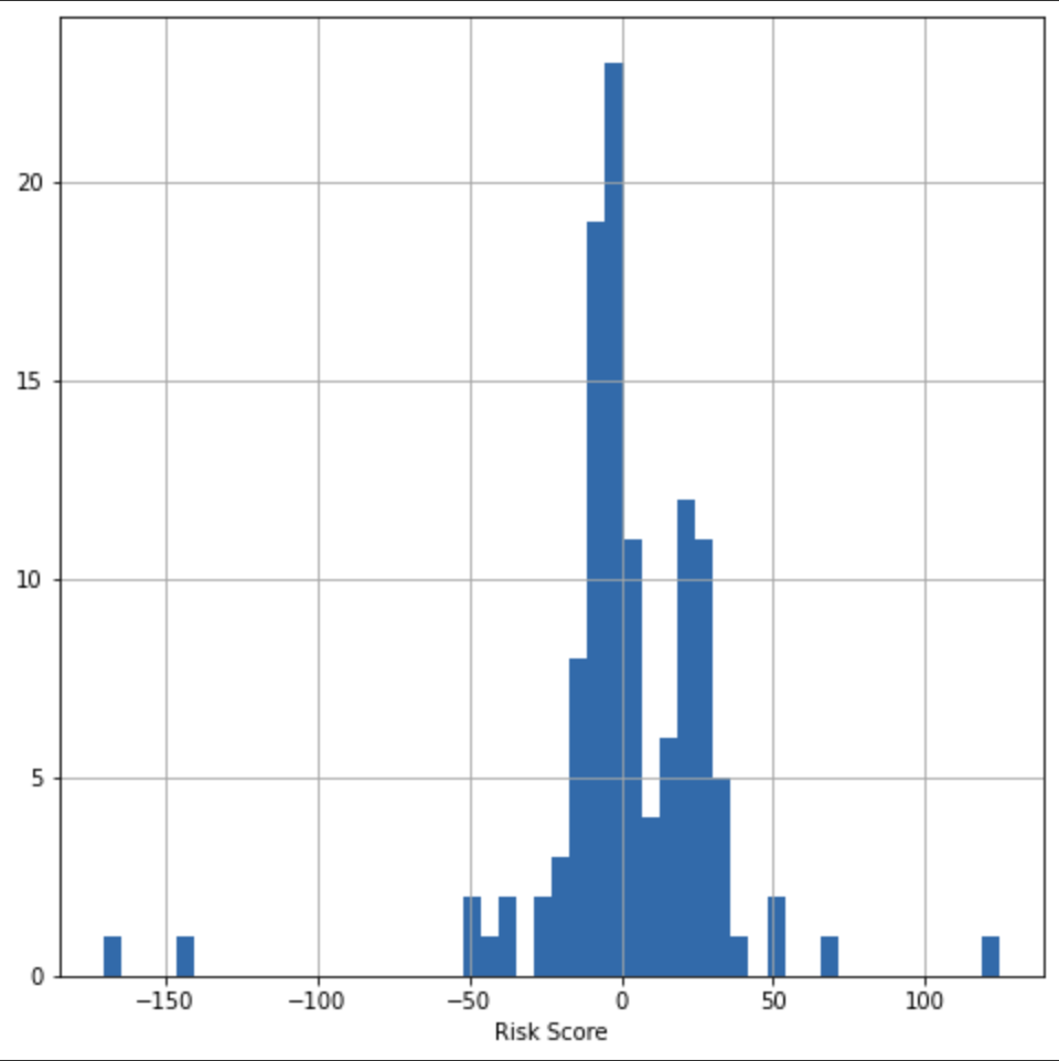 Figure 1. This histogram shows the distribution of insurance risk assessment scores based on our model. Most locations are clustered around a neutral risk assessment score of 0. Large positive risk assessment scores (skewed far right) represent unusually high-risk locations. Large negative risk assessment scores (skewed far left) represent unusually low-risk places. (see Figure 2)
